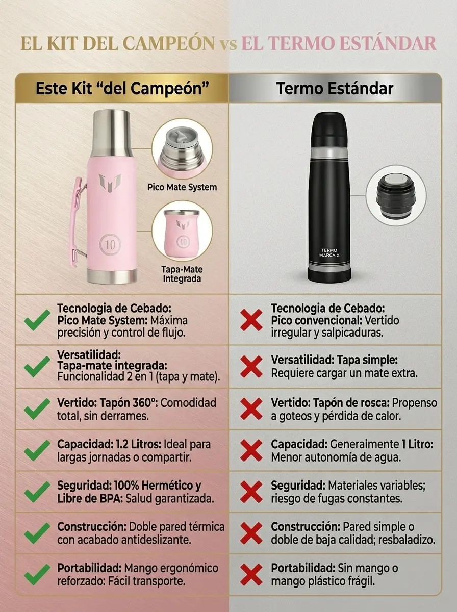 Termo: Mantiene la temperatura ideal (fría o caliente) por horas gracias a su doble capa de acero. Su manija lateral facilita el servicio con una sola mano.